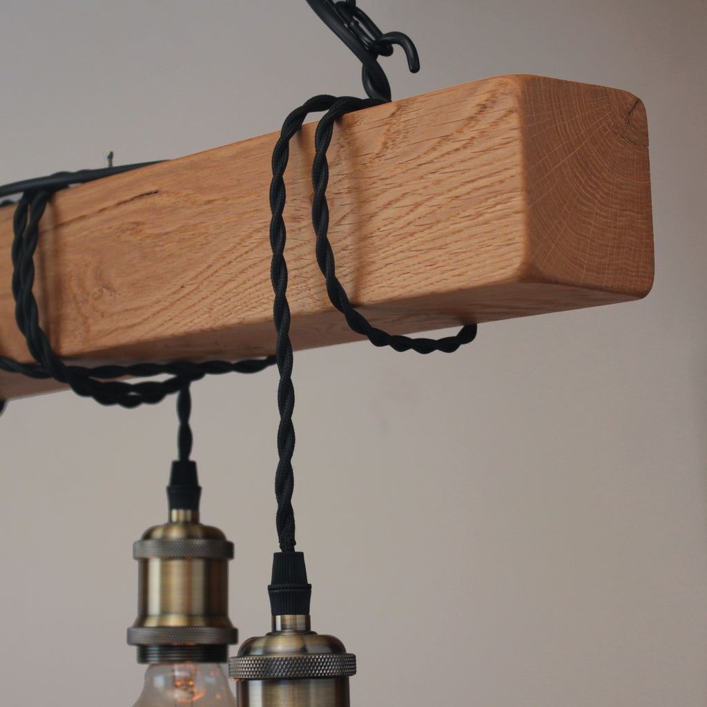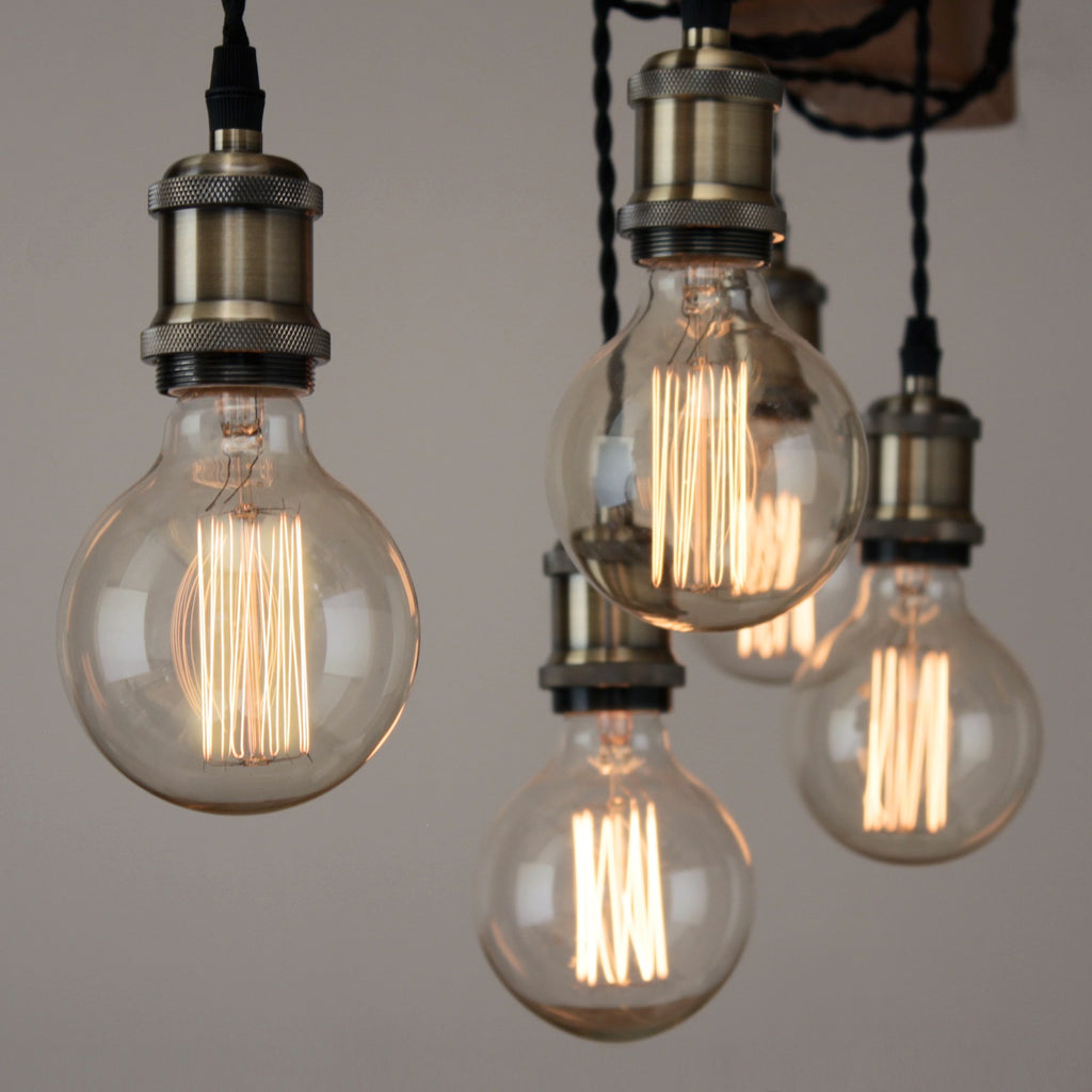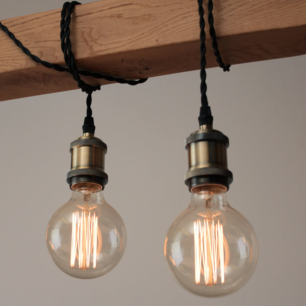 The five E27 bulb sockets are wired with black fabric twisted cables that can be wrapped around the beam freely. Please note: bulbs are not supplied. We recommend retro style Edison bulbs in your preferred shape - large globe (G95 - pictured), globe, teardrop, etc. Tungsten or LED filament, with E27 screw base up to 60 watts.